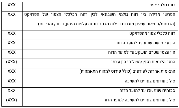 על תאגיד הפועל בתחום הנדל"ן היזמי אשר הציג בדוח התקופתי מידע בדבר רווח גולמי צפוי ויתרת עודפים צפויה למשיכה נדרש ביחס לפרויקטים אשר סווגו כ"מהותיים מאוד" לפרט את ההתאמות בין הרווח הגולמי הצפוי לבין יתרת העודפים הצפויה למשיכה. לעמדת סגל הרשות על הרווח הגולמי הצפוי שהתאגיד כולל גילוי לגביו לשקף את הרווח הגולמי החשבונאי כפי שהוא מוכר בהתאם לכללי חשבונאות מקובלים (להלן: "הרווח הגולמי"). לעיתים קרובות נתון זה שונה מהותית מסכום העודפים הצפויים למשיכה ולכן על התאגיד להציג את כל ההתאמות בין הרווח הגולמי הצפוי לבין יתרת העודפים הצפויה למשיכה, כמפורט בטבלה להלן: